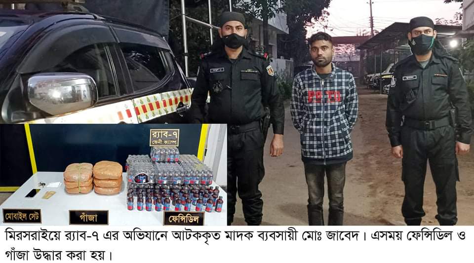 এসময় তার কাছ থেকে ৩৫৬ বোতল ফেনসিডিল ও ৬ কেজি গাঁজাসহ একটি প্রাইভেটকার জব্দ করা হয়। সে কুমিল্লা জেলার চৌদ্দগ্রাম থানার নেতরা এলাকার ইসমাইল মিয়ার ছেলে।