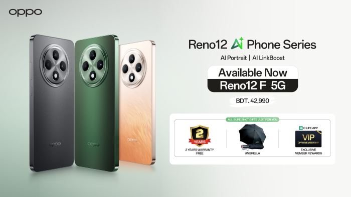 রেনো১২ এফ ফাইভজি ডিভাইসটি কিনলেই গ্রাহকরা বিশেষ উপহার হিসেবে পাচ্ছেন দুই বছরের ওয়ারেন্টি, একটি ছাতা ও এক্সক্লুসিভ মেম্বার রিওয়ার্ডস।