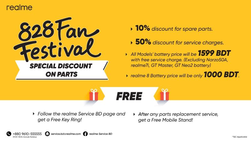 এছাড়াও, গ্রাহকরা বাংলাদেশের রিয়েলমি সার্ভিস সেন্টার-এর ফেসবুক পেজ (https://www.facebook.com/realmeServiceBD) ফলো করলে পেতে পারেন একটি ফ্রি চাবির রিং, আর যেকোনো পার্টস পরিবর্তনে পেতে পারেন একটি ফ্রি মোবাইল স্ট্যান্ড। এই অফারটি প্রযোজ্য হবে ২০-৩১ আগস্ট পর্যন্ত।