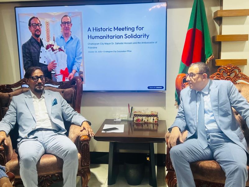 সাক্ষাৎ শেষে শাহাদাত ফিলিস্তিনের রাষ্ট্রদূতকে চট্টগ্রাম নগরবাসীর পক্ষ থেকে সংহতির প্রতীকী স্মারক উপহার দেন।