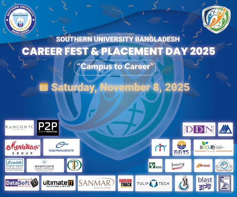 শিক্ষার্থীদের জন্য ক্যাম্পাস থেকে চাকরির সুযোগ করে দিতে সাউদার্ন ইউনিভার্সিটি বাংলাদেশের উদ্যোগে বায়েজিদ আরেফিন নগরে আগামী শনিবার (৮ নভেম্বর) অনুষ্ঠিত হবে দিনব্যাপী ক্যারিয়ার ফেস্ট ও প্লেসমেন্ট ডে।