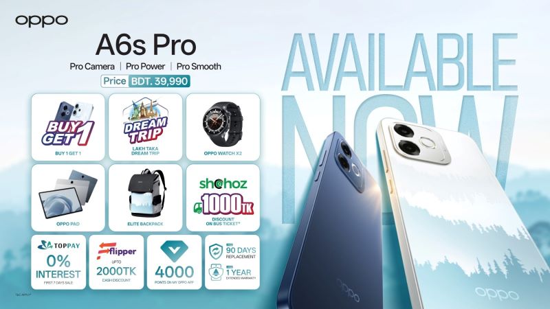 এই ঈদে কেনাকাটার অভিজ্ঞতাকে আরও আনন্দময় করতে অপো এ৬এস প্রো ক্রেতারা টপপের মাধ্যমে ০ শতাংশ সুদে কিস্তি সুবিধা, একটি এলিট ব্যাকপ্যাক ফ্রি গিফট, ৯০ দিনের ফ্রি রিপ্লেসমেন্ট ওয়ারেন্টি এবং এক বছরের ফ্রি এক্সটেন্ডেড ওয়ারেন্টি প্ল্যান উপভোগ করতে পারবেন। পাশাপাশি, ক্রেতারা ফ্লিপার থেকে সর্বোচ্চ ২ হাজার টাকা পর্যন্ত ক্যাশ ডিসকাউন্ট এবং মাই অপো অ্যাপের মাধ্যমে ৪ হাজার রিওয়ার্ড পয়েন্ট অর্জনের সুযোগ পাবেন।